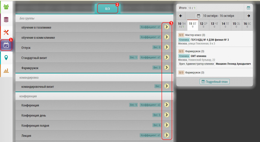 Нажмите на раздел Планирование (1), выберите вкладку В/Э (2) и запланируйте тип визита через стрелочку (3) на нужную дату