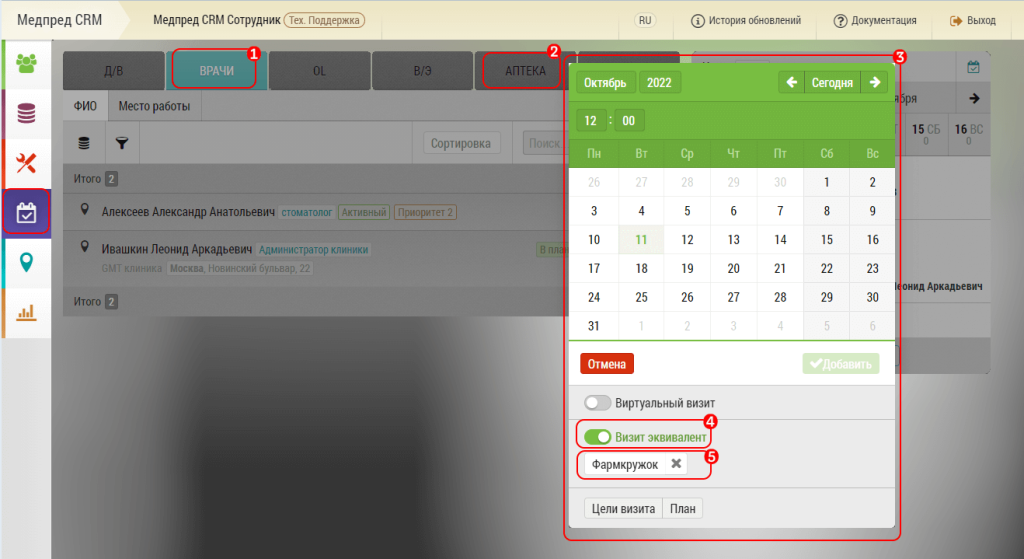 Нажмите на раздел Планирование , выберите вкладку “Врачи”(1) или “Аптеки” (2) или “Клиники” (2) и запланируйте визит через желтую стрелочку на нужную дату. Откроется календарь (3)