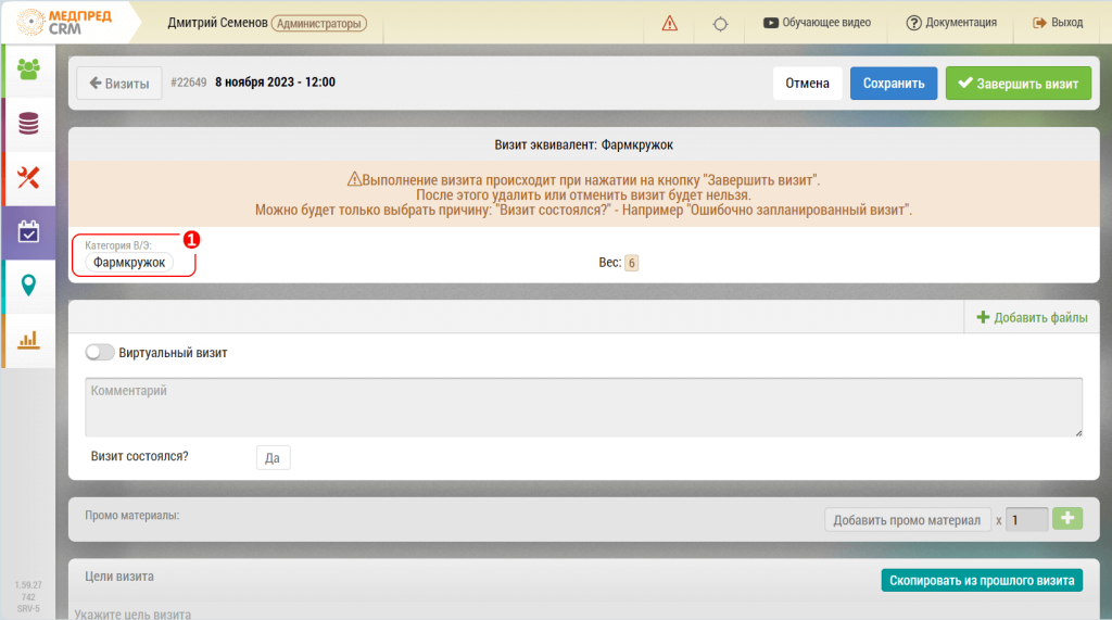 Выберите нужную дату, нажмите на кнопку (4) и сделайте визит – эквивалент активным. Обязательно выберите тип визит эквивалента (5), в противном случае визит-эквивалент будет запланирован, но на карточке визита будет гореть напоминание, что ” Категория визита не корректна. Не была задана или удалена администратором”. В этом случае программа не даст Вам завершить визит. Выберите корректную категорию Визит – эквивалента